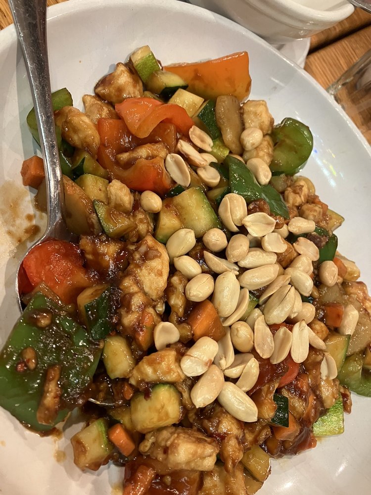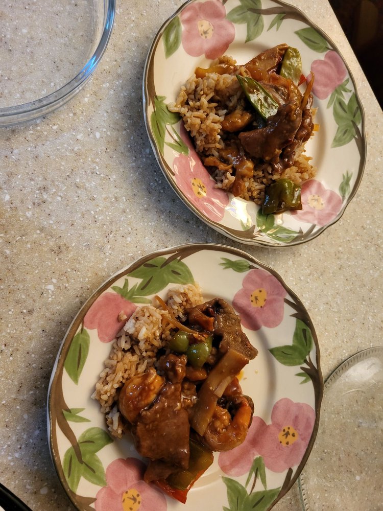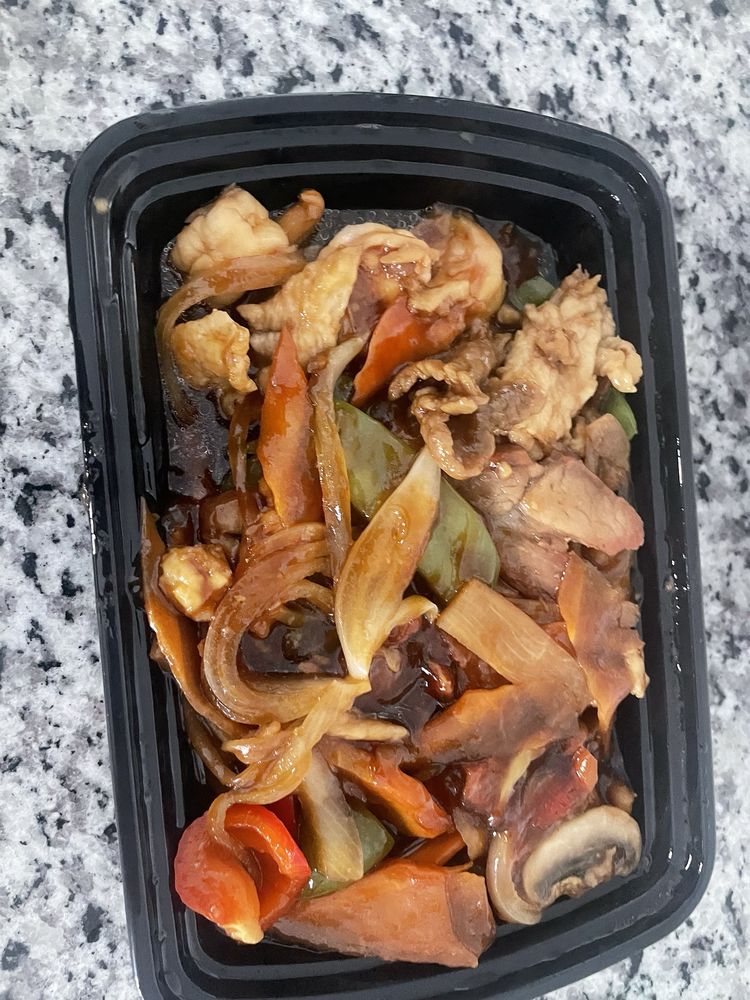 Chicken with onions and mushrooms stir-fried with spicy brown sauce.